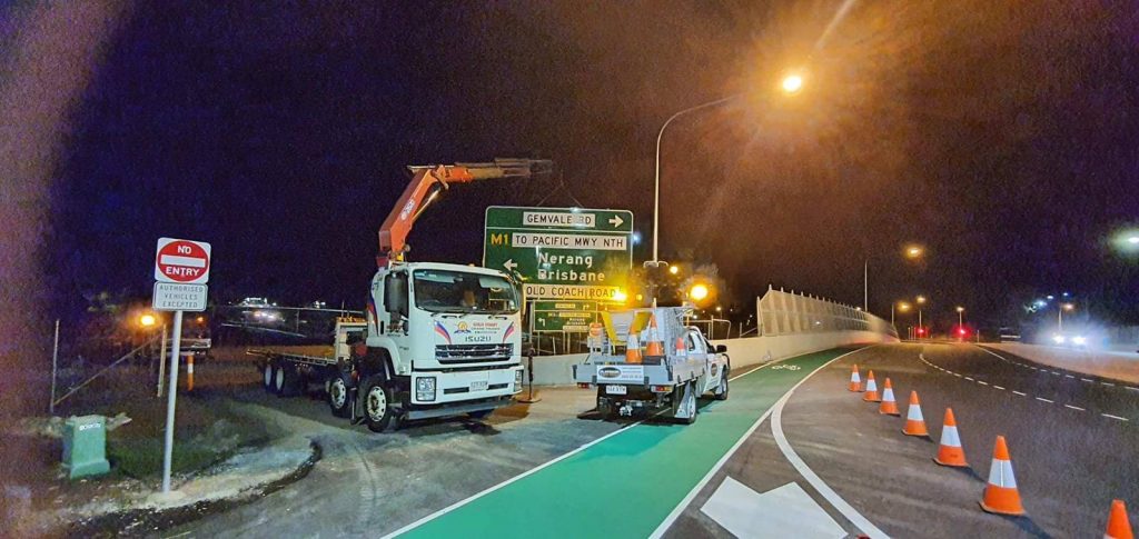 Our operator loaded the wall onto his truck, transported them to the nearby job site, and then placed the barrier into its desired position. A ground guide assisted OTM’s Crane Truck hire operator with interlocking the nine walls together. The entire process to set 108 feet of concrete barrier took less than 3 hours.